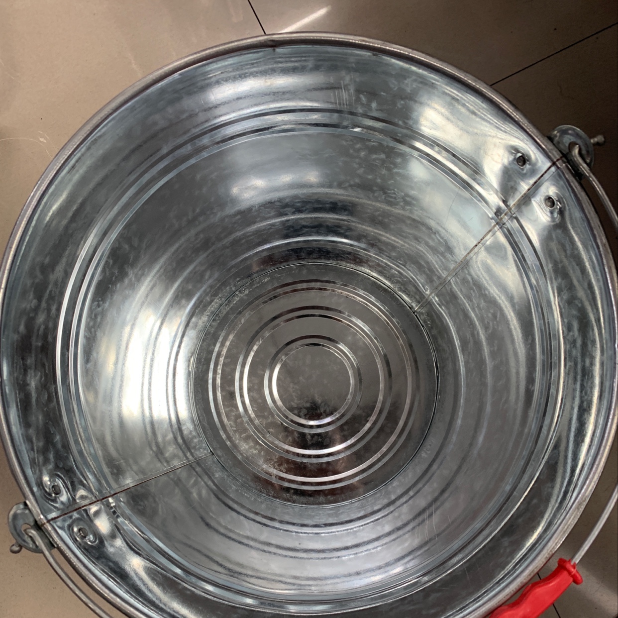 黑色塑料桶,红色提手,置于光滑瓷砖地面,简约实用。水桶塑料水桶