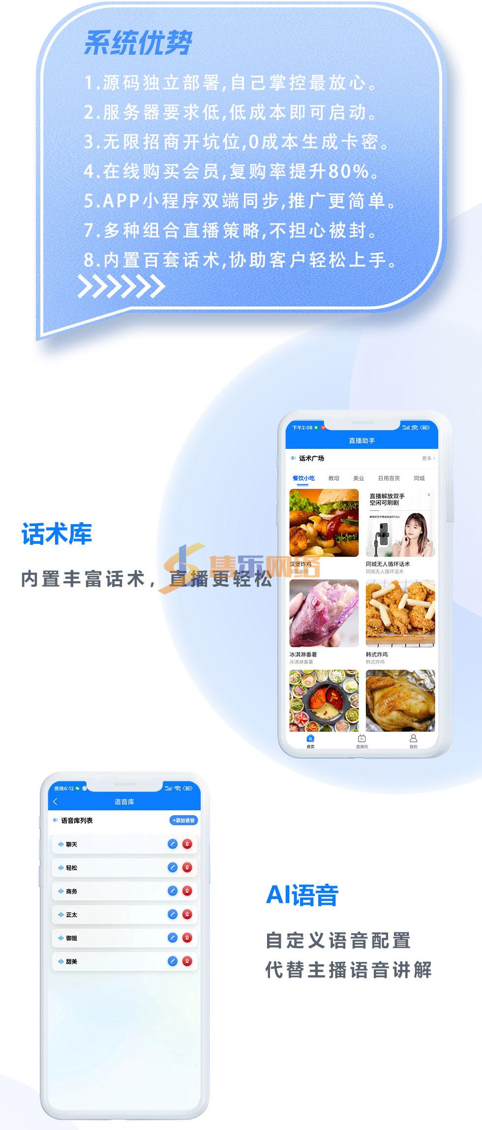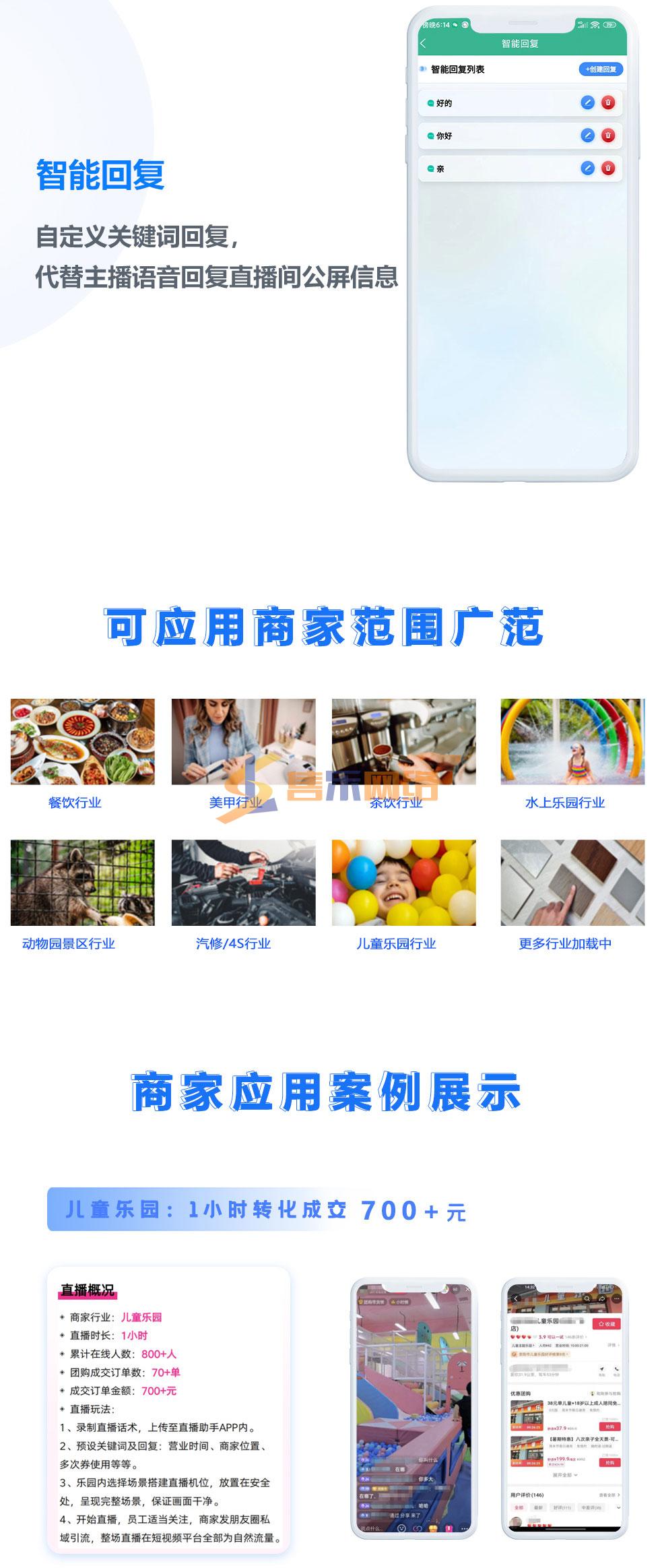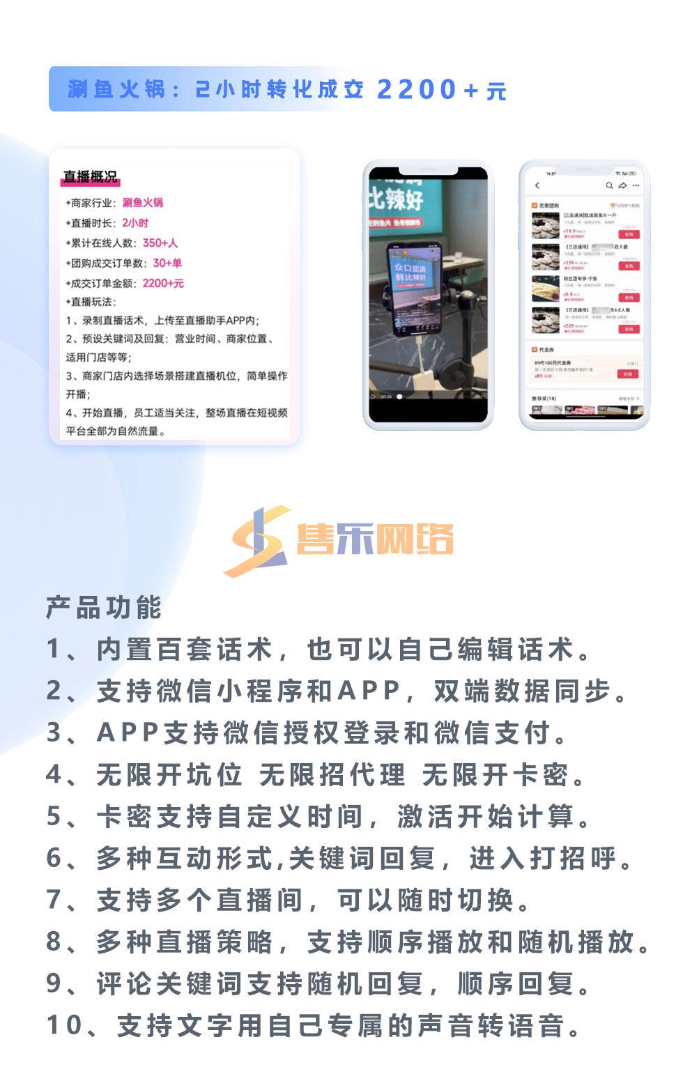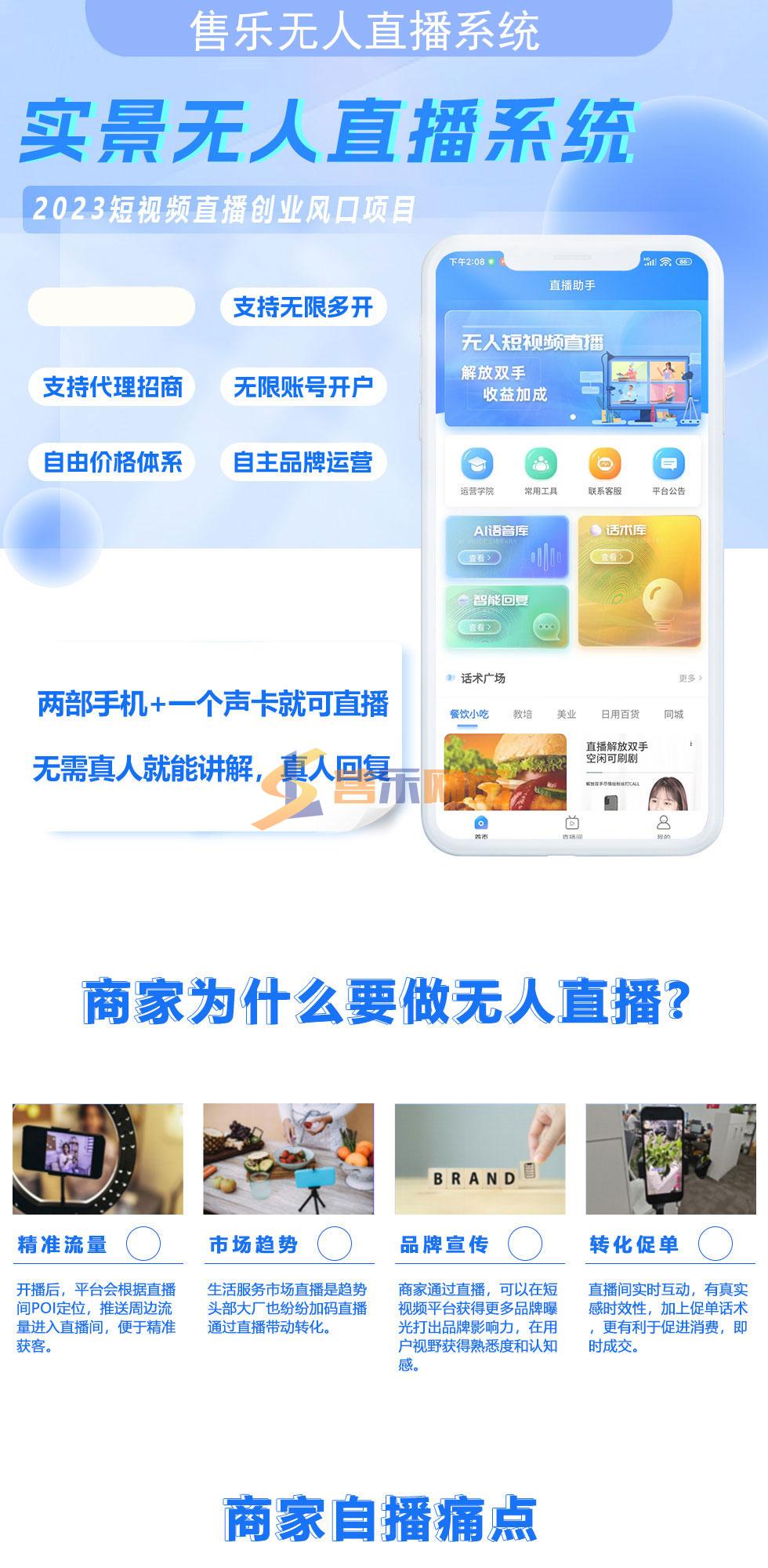产品特点:1.真实实景AI|直播| 实景|直播|对封号限流说再见!2.模似真人语音讲解 无须高薪雇佣或培养主播低成本开|直播|!3.24小时|直播|不怕累 自定义语术,无需主播可实现24小时|直播|!4.智能互动回复 支持|直播|间公屏回复,自动语音回复互动!5.已上线产品即买即用 风口时间有限,别在众筹了,别在等其它公司开发了否则黄瓜菜都凉啦!抖音同城精准推流,人人可带货,独立源码部署,支持无限多开,可无限招代理,无限开账号,提供APP独立品牌封装你也可以成为无人|直播|源头厂家,招商加盟快速赚钱。